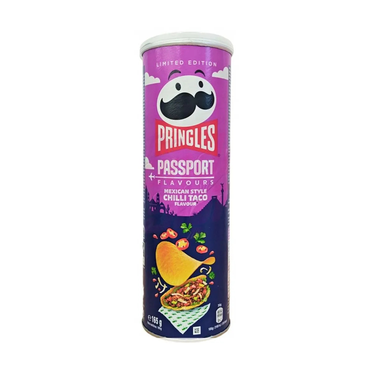 Snack salato al gusto di chili-taco. Ingredienti: patate disidratate, oli vegetali (girasole, palma, mais) in proporzione variabile, farina di frumento, farina di mais, farina di riso, condimento al gusto di chili-taco (maltodestrina, lattosio in polvere [latte], cipolla in polvere, aglio in polvere, paprika in polvere, spezie [cumino, pepe di Caienna, pepe nero, estratto di peperoncino jalapeno], sale, zucchero, aromi, acidificanti [acido citrico, acido malico], pomodoro in polvere, origano, olio di colza, colorante [estratto do paprika]], maltodestrina, emulsionante (E471), sale, colorante (norbissina di annatto). Può contenere soia.